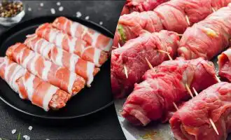 Cortar o tomate e a carne em rodelas e ralar o queijo. Passe o alho por uma prensa. Pique as ervas aromáticas. Misture todos os produtos, cobrindo o recheio com natas azedas para ficar mais suculento. Tempere com sal e pimenta. Embrulhe as panquecas com chinka e sirva quente.