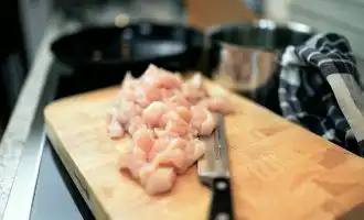 - Lavar os filetes de frango, secar com papel absorvente, cortar em cubos médios, sal, pimenta, adicionar o alho e misturar.