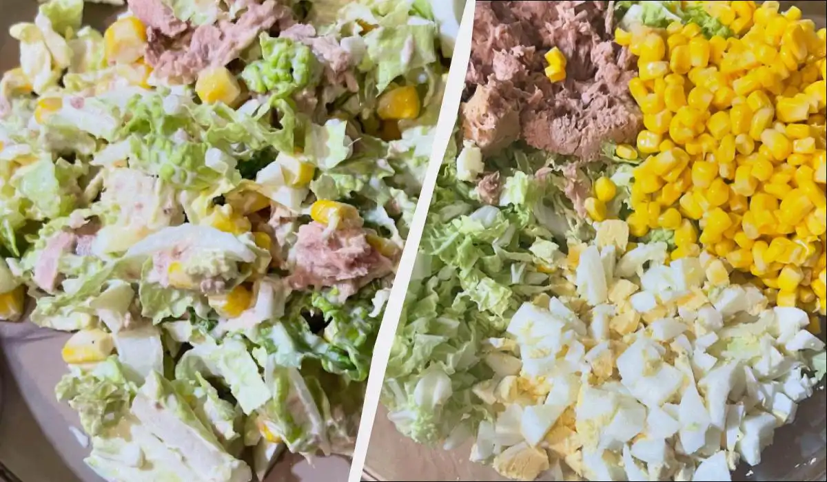 Cozer os ovos bem cozidos e cortá-los em cubos. Pique finamente a couve. Escorrer o atum e o milho. Misturar todos os ingredientes. Tempere a salada de atum com couve à Pequim e milho com natas azedas, maionese ou uma mistura destes molhos, bem como tempere com sal.