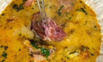 Unte uma forma com óleo, deite nela as batatas cortadas em rodelas finas e salgue-as. Em seguida, misture numa tigela as natas azedas, o queijo, os ovos e o filete de frango cortado em cubos. Deite a mistura sobre as batatas.