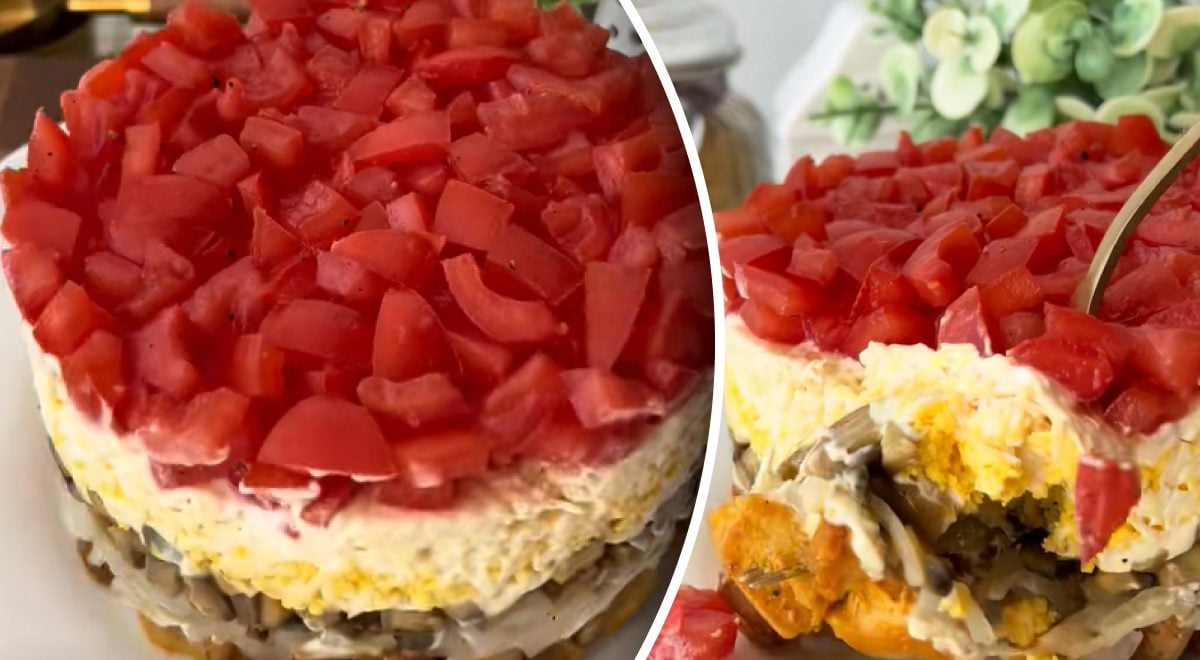 Em seguida, disponha a salada em camadas: frango frito, cebolas em conserva, cogumelos fritos, ovos cozidos ralados, queijo fundido ralado e tomates frescos cortados às rodelas. Untar cada camada com maionese e adicionar especiarias a gosto.
