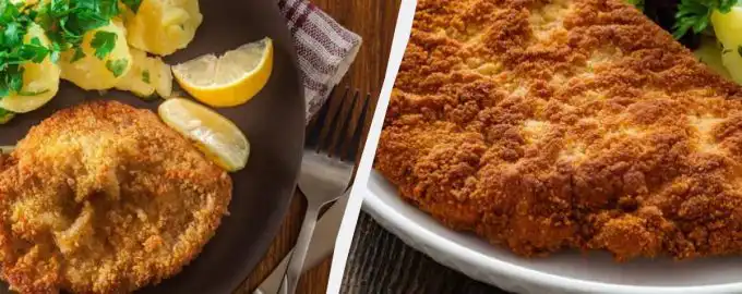 A receita correta não envolve massa de ovo ou pão ralado. Pode cozinhar facilmente schnitzel de porco ou de frango em casa / collage My, photo depositphotos.