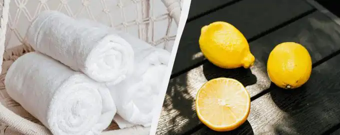 O sumo ou ácido de limão ajudará a eliminar até as manchas mais difíceis da toalha. Como branquear os panos de cozinha em casa / collage My, foto...